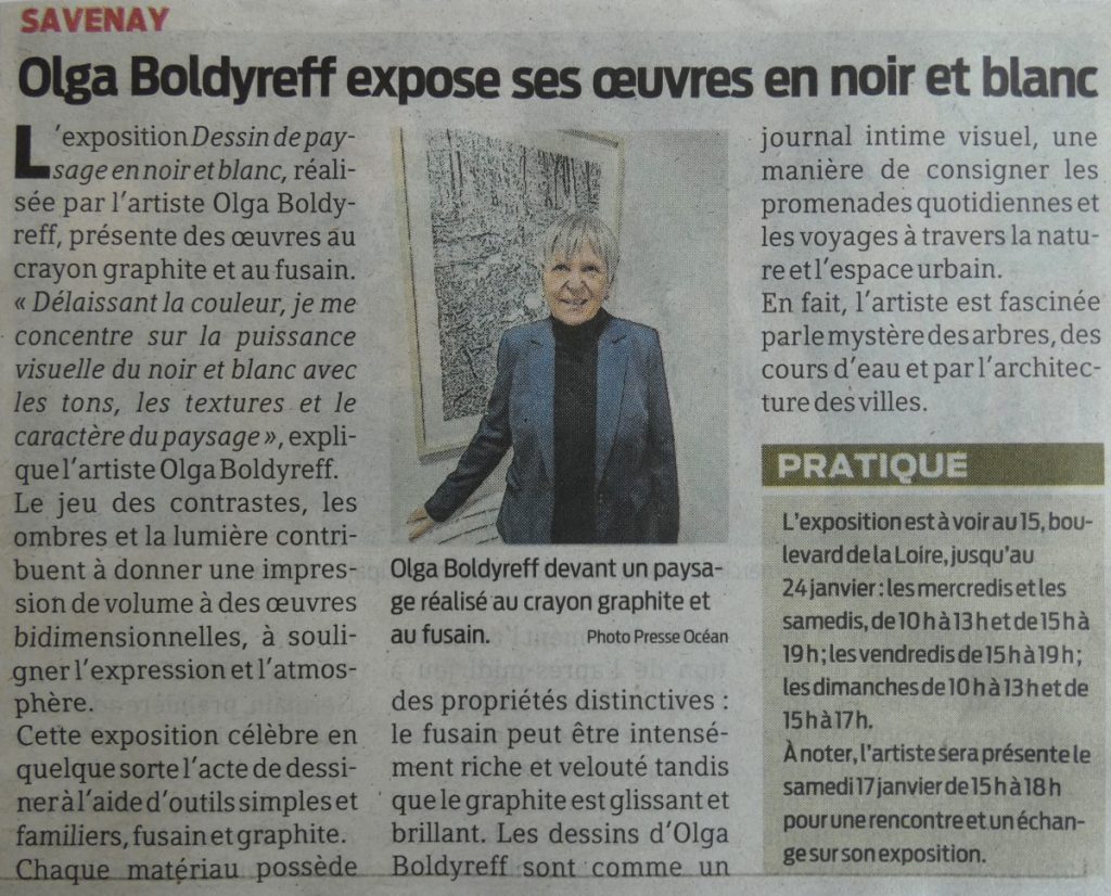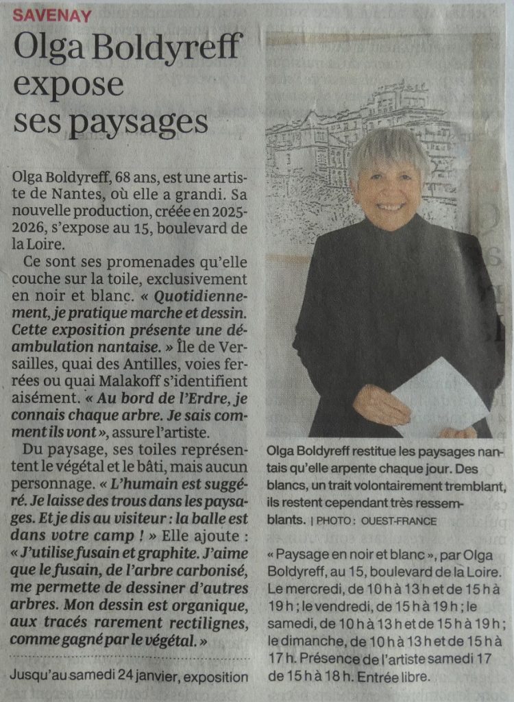 Exposition Olga Boldyreff ≈ 10 au 24 janvier Presse Océan 13 janvier 2026 Ouest-France 16 janvier 2026 Exposition Claire Cailly ≈ 08 novembre au 06 décembreInauguration du 15 ≈ 31 août et 1er sept. 2019